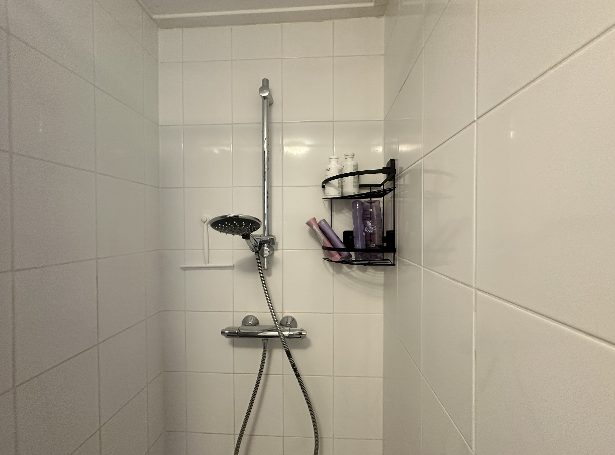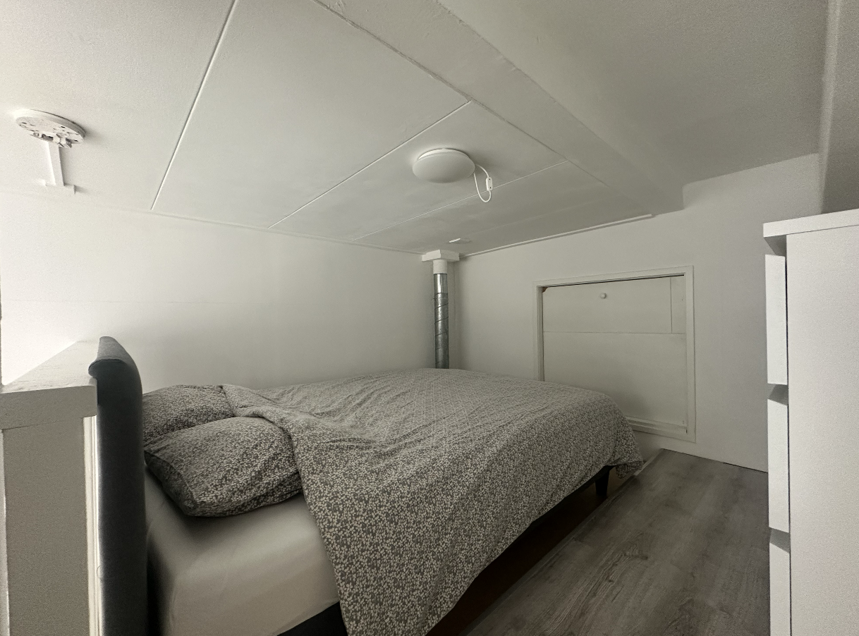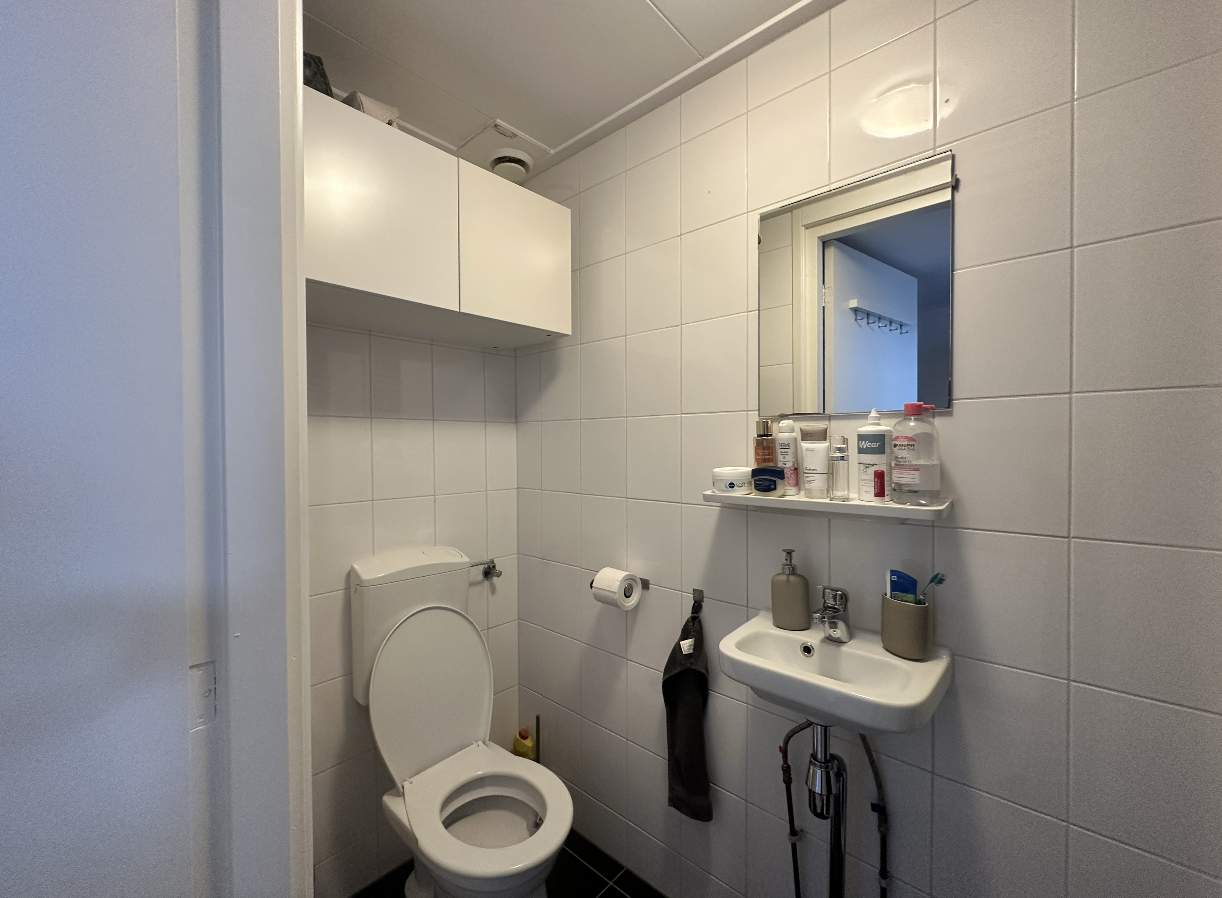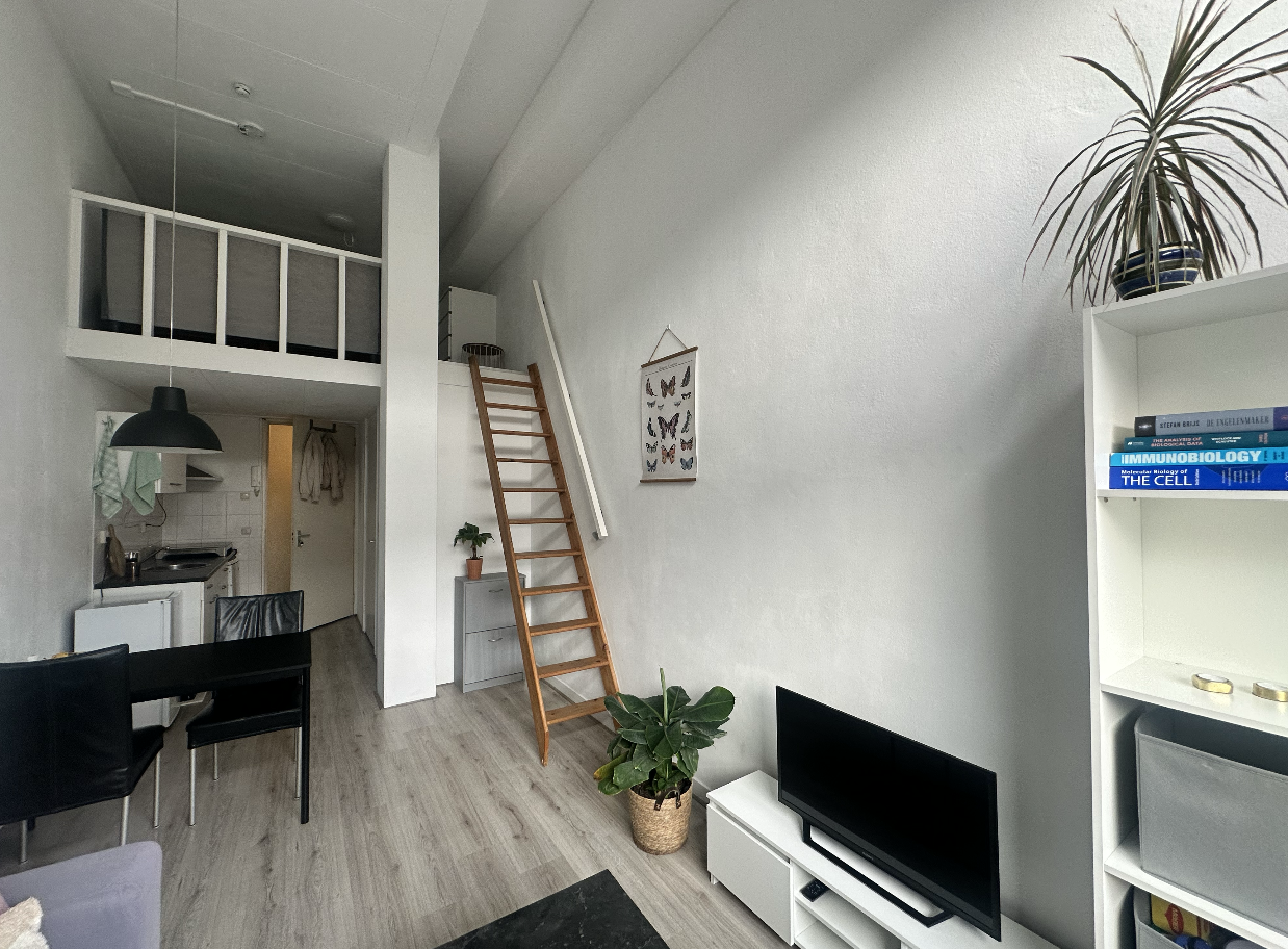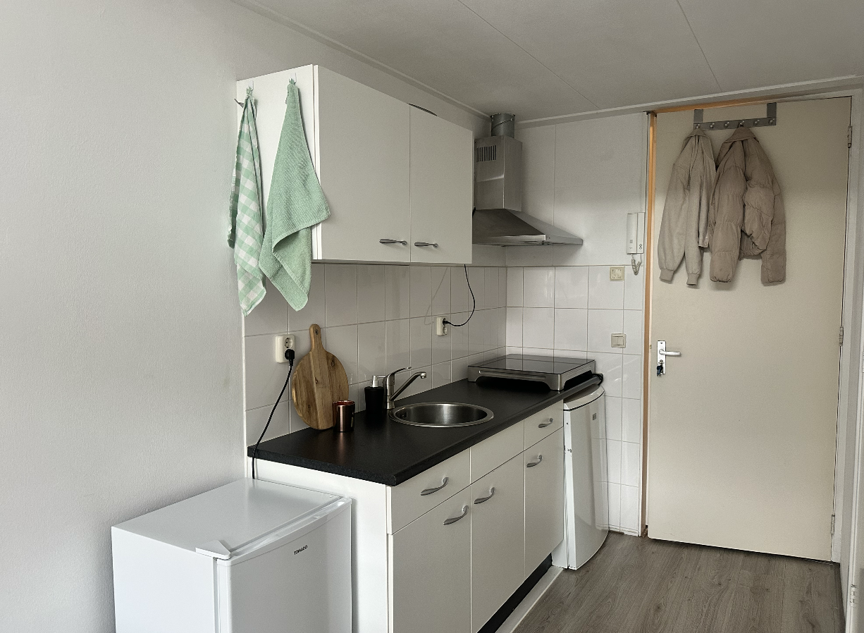 De studio is gelegen op de eerste verdieping van het complex en is bereikbaar via de gemeenschappelijke ingang. De keuken beschikt over een losstaande koelkast en een losstaande vier-pits kookplaat, er is voldoende kastruimte voor het opbergen van je kookgereedschap. De studio beschikt over een vide waar met gemak een tweepersoons bed kan worden neergezet en er daarnaast nog ruimte is voor het plaatsen van een lage (kleding)kast. Op de gemeenschappelijke gang bevindt zich een afsluitbare berging kast van 80 cm breed en 90 cm diep welke dienstdoet als bergruimte.