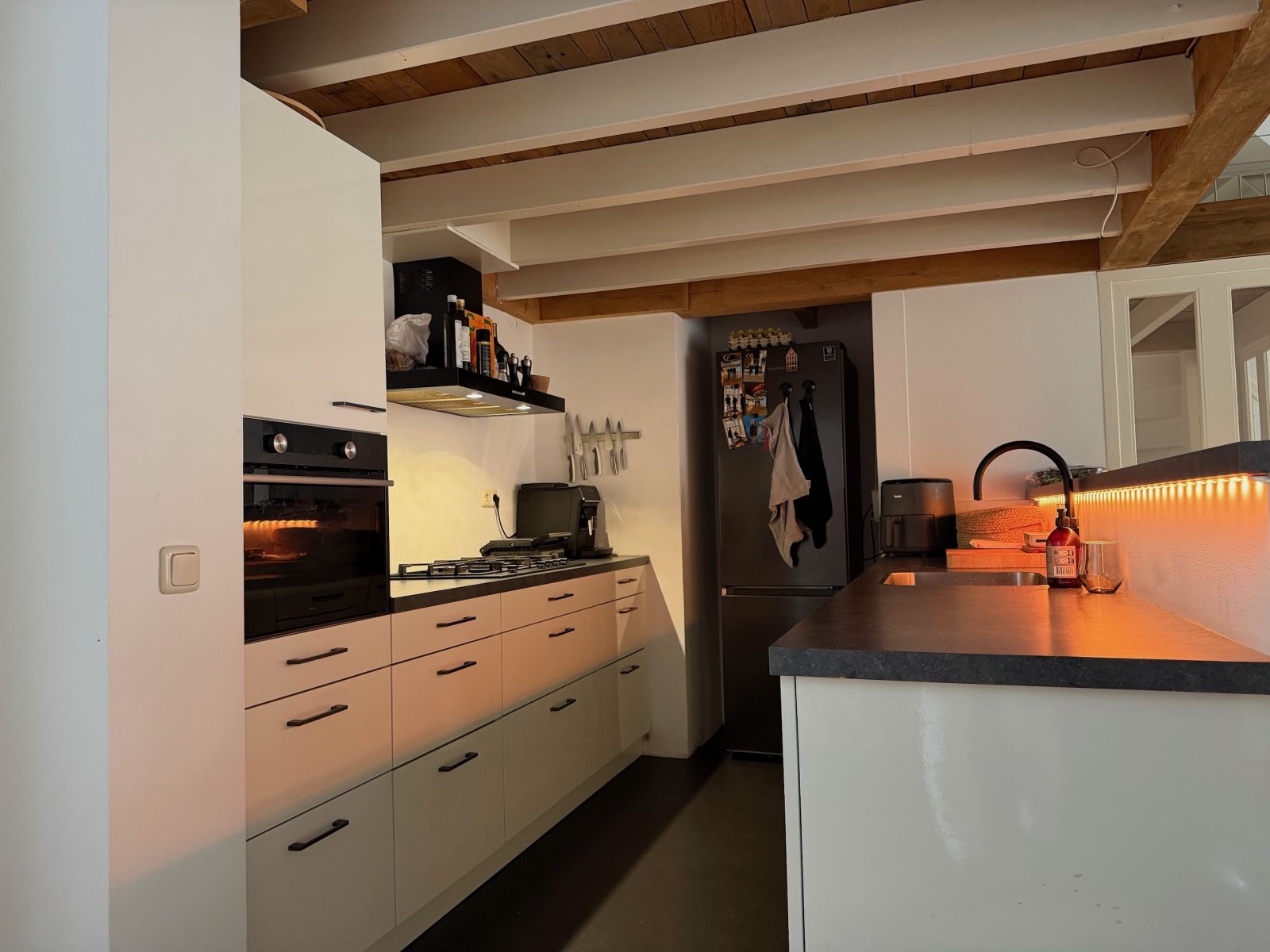 Het appartement is bereikbaar vanaf de eerste verdieping en beschikt over een ruime woonkamer met open keuken. De keuken is voorzien van diverse inbouwapparatuur, waaronder een vaatwasser, koelkast, oven, gaskookplaat en afzuigkap.