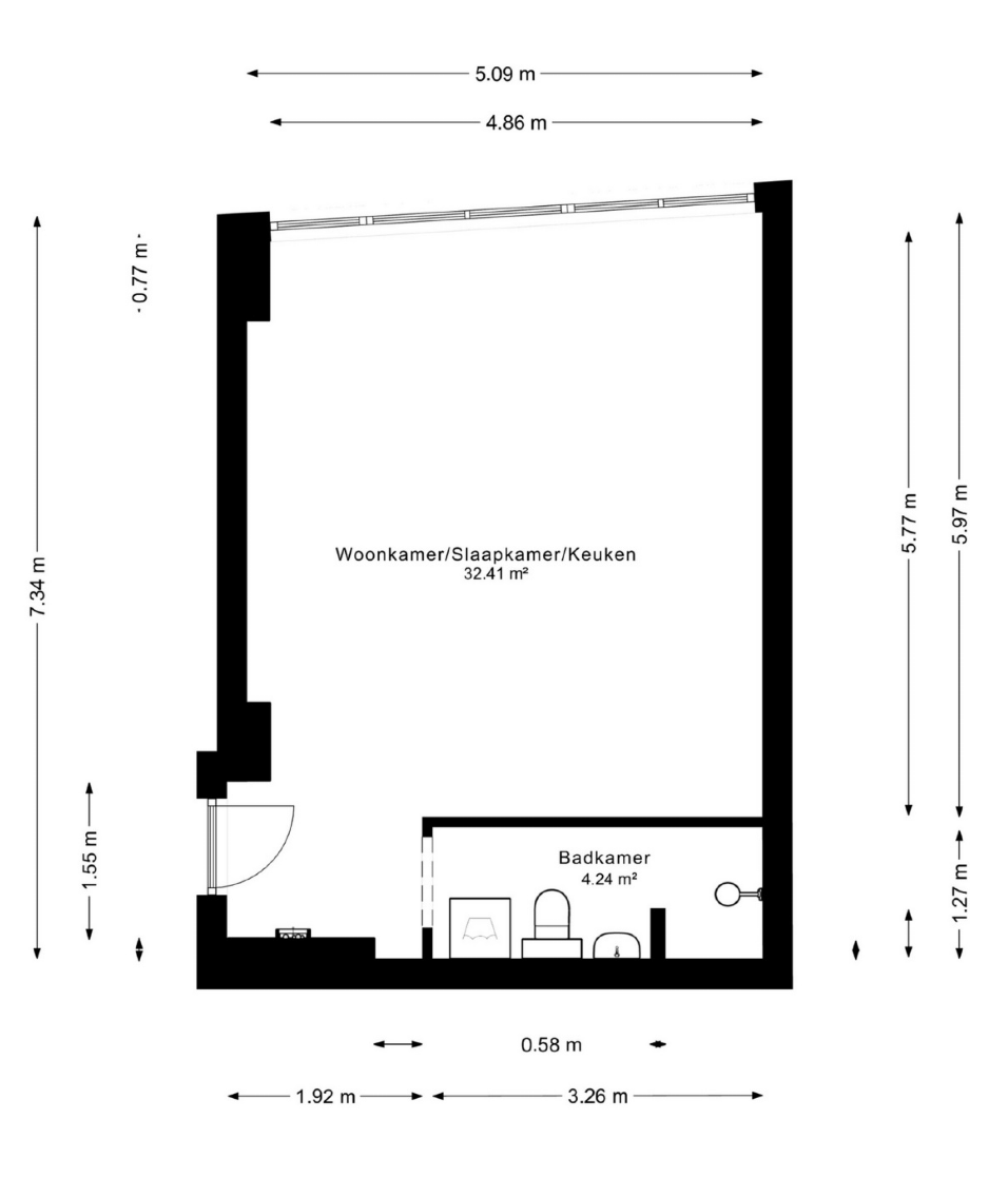 De woon-/slaapkamer van 32 m2 beschikt over een (split)airco waarmee de studio zowel verwarmd als verkoeld kan worden, de keuken is voorzien van een luxe mengkraan, spoelbak, inductiekookplaat, vaatwasser, koelkast (met vriesvakje), afzuigkap en een combimagnetron. De badkamer is voorzien van een inloop (regen)douche, een hangend toilet en een wastafelmeubel.