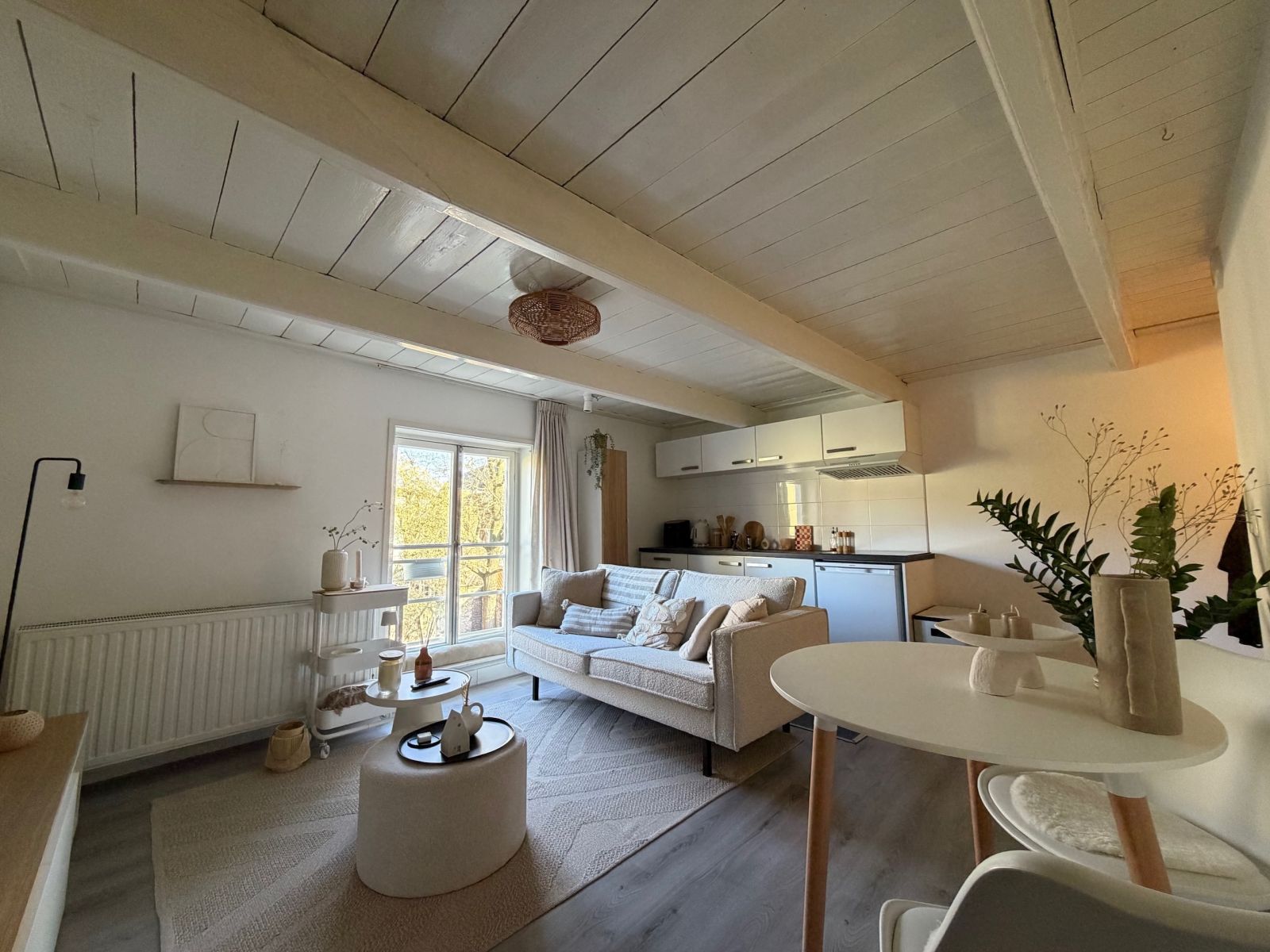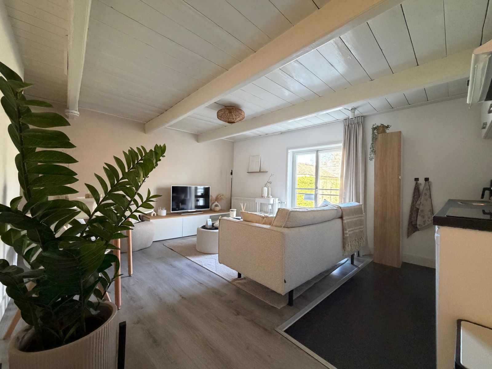 De keuken is uitgerust met een kookplaat, afzuigkap en een koel-vriescombinatie. Via de trap betreed je de slaapkamer.