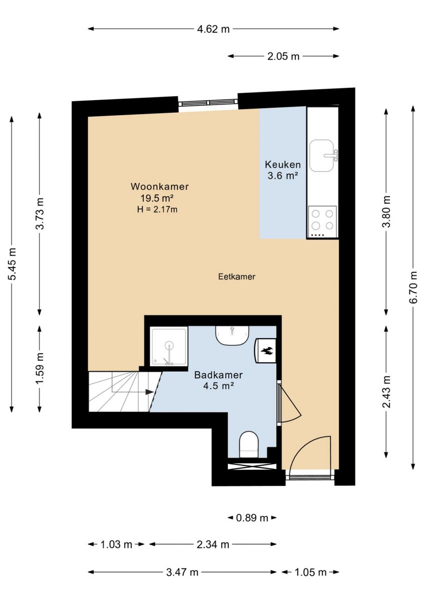 Het appartement ligt op de tweede verdieping aan de achterzijde van het pand. Bij binnenkomst bevindt zich aan de linkerzijde de badkamer, die is voorzien van een douchecabine, wastafel, toilet en een wasmachineaansluiting. Aansluitend kom je in de woonkamer met open keuken.